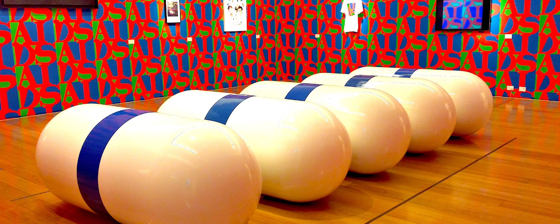 Au centre de la dernière salle trônent d’énormes pilules évoquant le traitement médicamenteux qui contraint les malades. Les murs sont tapissés du logo AIDS (SIDA en anglais) reproduit des dizaines de fois, comme le virus se reproduit dans le corps. On se rappelle alors l’entrée de l’expo et ses innombrables pilules incrustées dans le mur, qui représentent la quantité exacte de médicaments à prendre en un an si l’on est malade du SIDA.